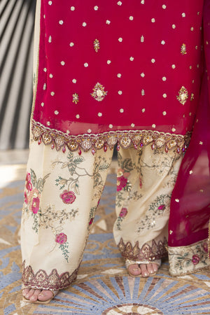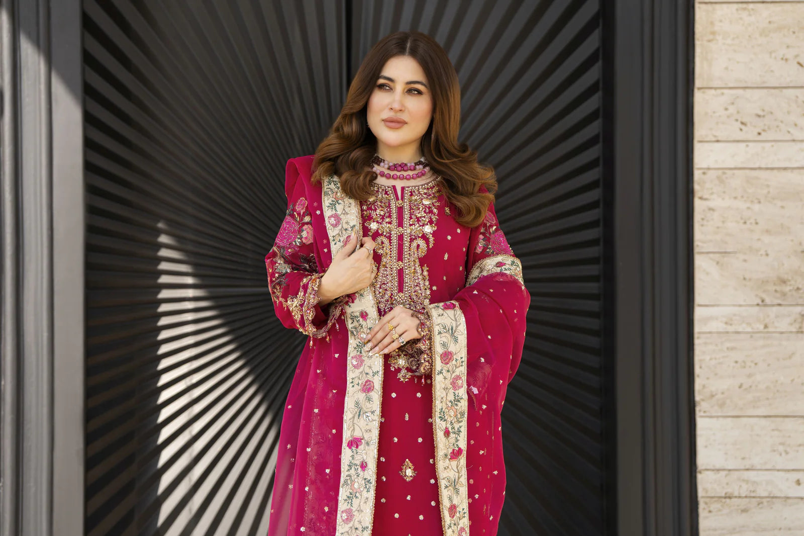 Turn every head this season with Radha, a breathtaking formal ensemble in a striking shocking pink hue. The chiffon shirt features delicate handwork along the neckline, sleeves, and daman, radiating pure elegance. Paired with an embroidered silk shalwar and a gracefully flowing organza dupatta, this outfit perfectly balances luxury and tradition.