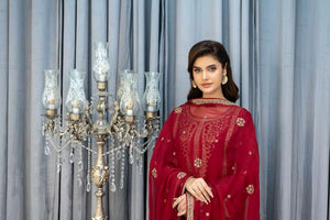 Experience timeless grace with our luxurious silk ensemble. The shirt is beautifully adorned with intricate threadwork, sequin, and tilla embroidery, creating a perfect balance of elegance and charm. It is paired with an embroidered chiffon dupatta that adds a soft, feminine touch. The look is completed with a grip fabric plazo, detailed with an exquisite embroidered patch — making this outfit a stunning choice for festive and formal occasions.