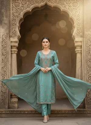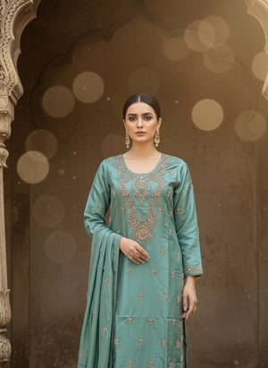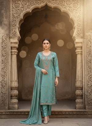 Crafted in premium silk from head to toe, this masterpiece exudes timeless elegance. The shirt and bottom flow effortlessly, while the silk dupatta is elevated with intricate hand embroidery. Adorned with kora, sequins, tilla, delicate threadwork, and pearls, every detail is a reflection of true artistry. Perfect for making a graceful statement at any occasion.