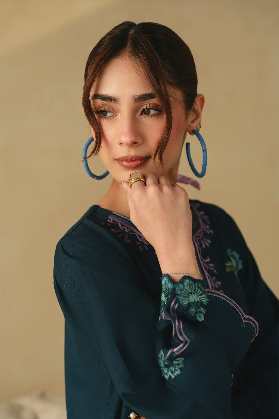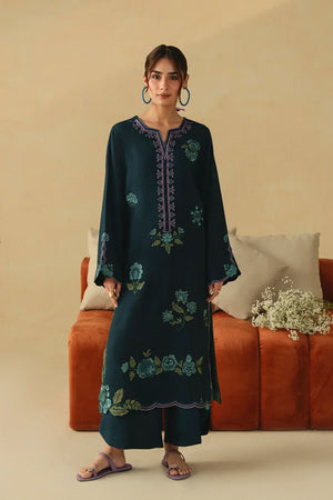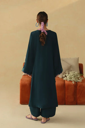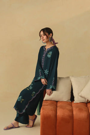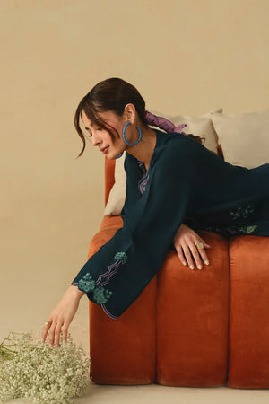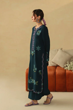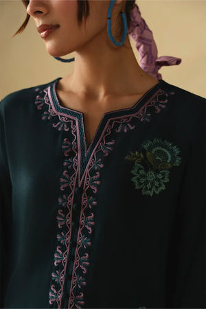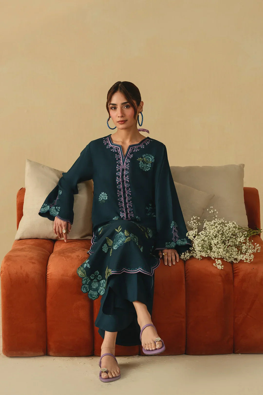 • A refined two-piece ensemble featuring a long embroidered shirt paired with wide-leg trousers, beautifully finished with delicate floral scalloping and intricate embroidery details for an elegant and timeless look.