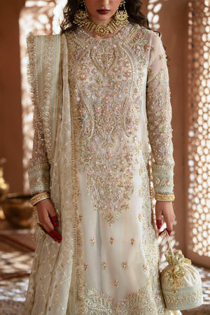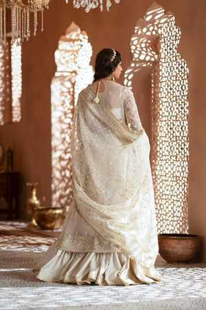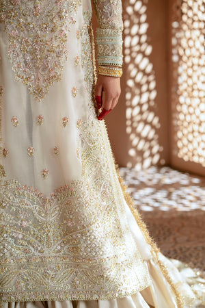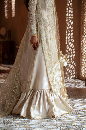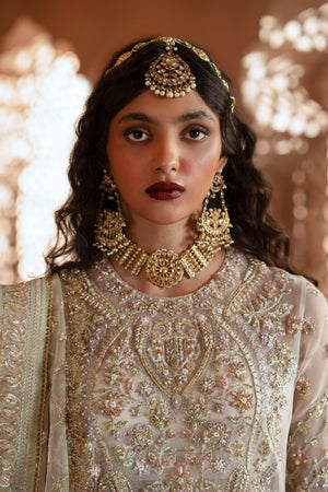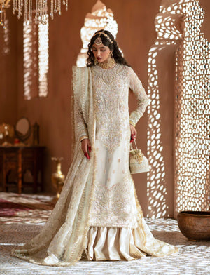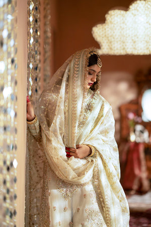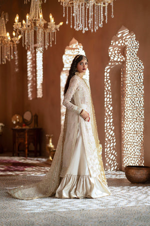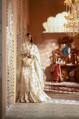 This wedding ensemble is a tribute to the serene yet powerful presence of Ruhaani Begum crafted for a bride who exudes royalty, purity, and timeless charm. Step into your wedding day as a true Empress, draped in an heirloom of Mughal magnificence.