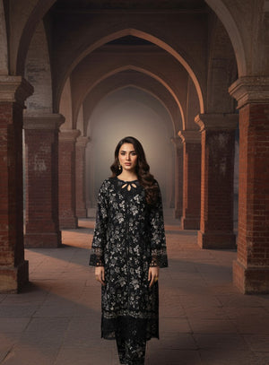 Embroidered viscose fabric featuring intricate threadwork that adds elegance and charm to your look.