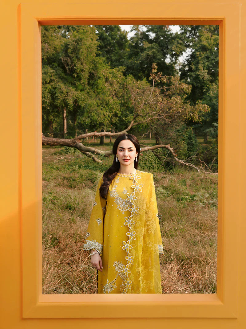 Organza burnout dupatta, a vision of elegance, boasts embossed textures and is graced with outlined applique floral spangle embroidery