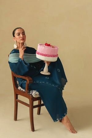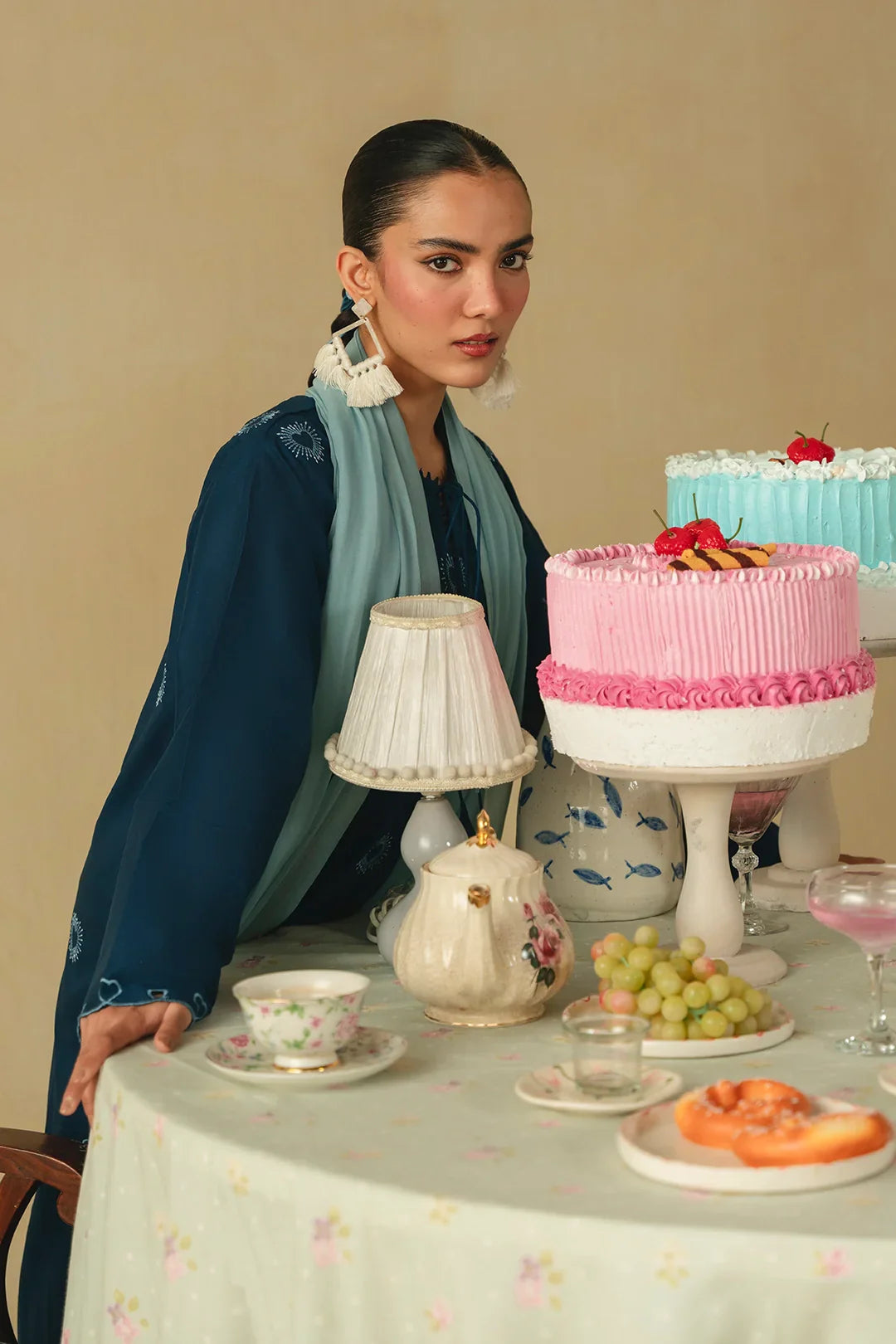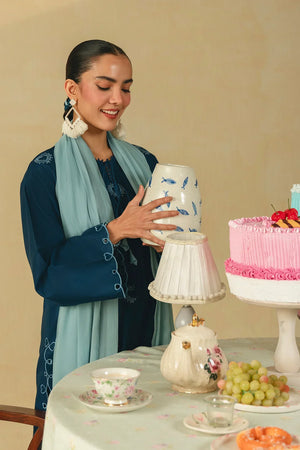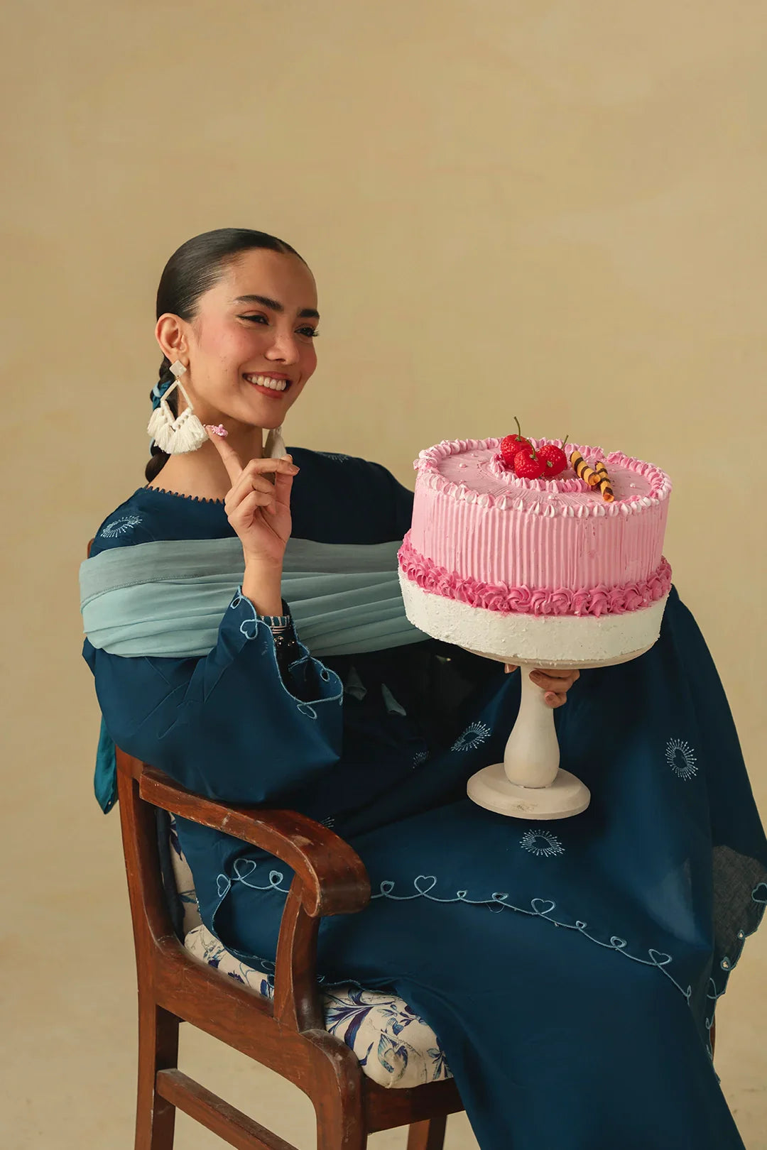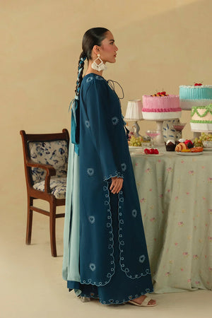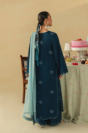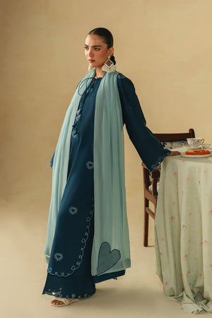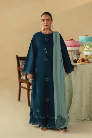 • An elegant three-piece ensemble featuring a long shirt adorned with all-over embroidery and delicate scalloped heart details along the hem. The look is completed with matching scalloped trousers embellished with heart embroidery, paired with an embroidered dupatta finished with heart motifs on each corner for a refined and romantic touch.