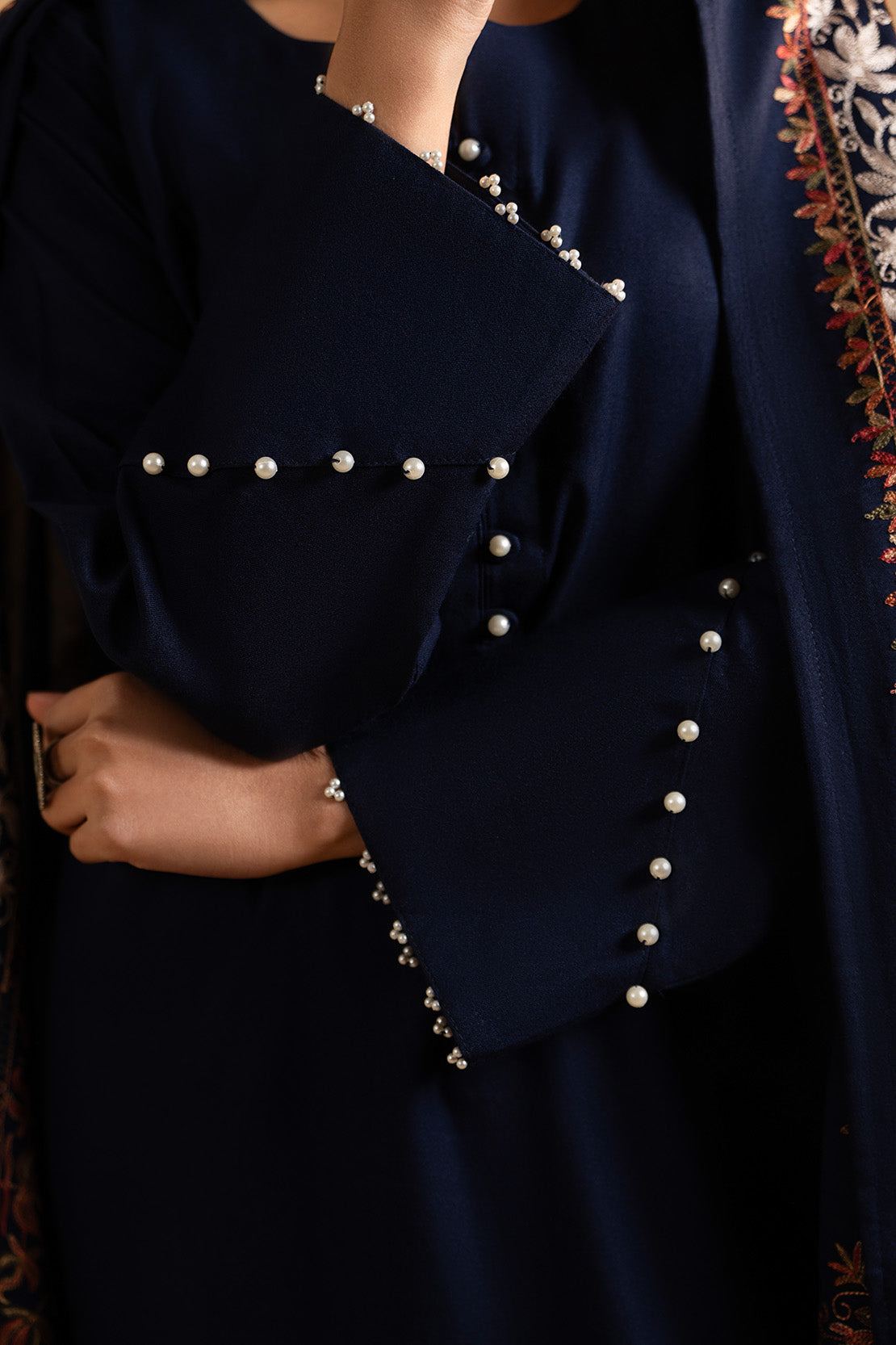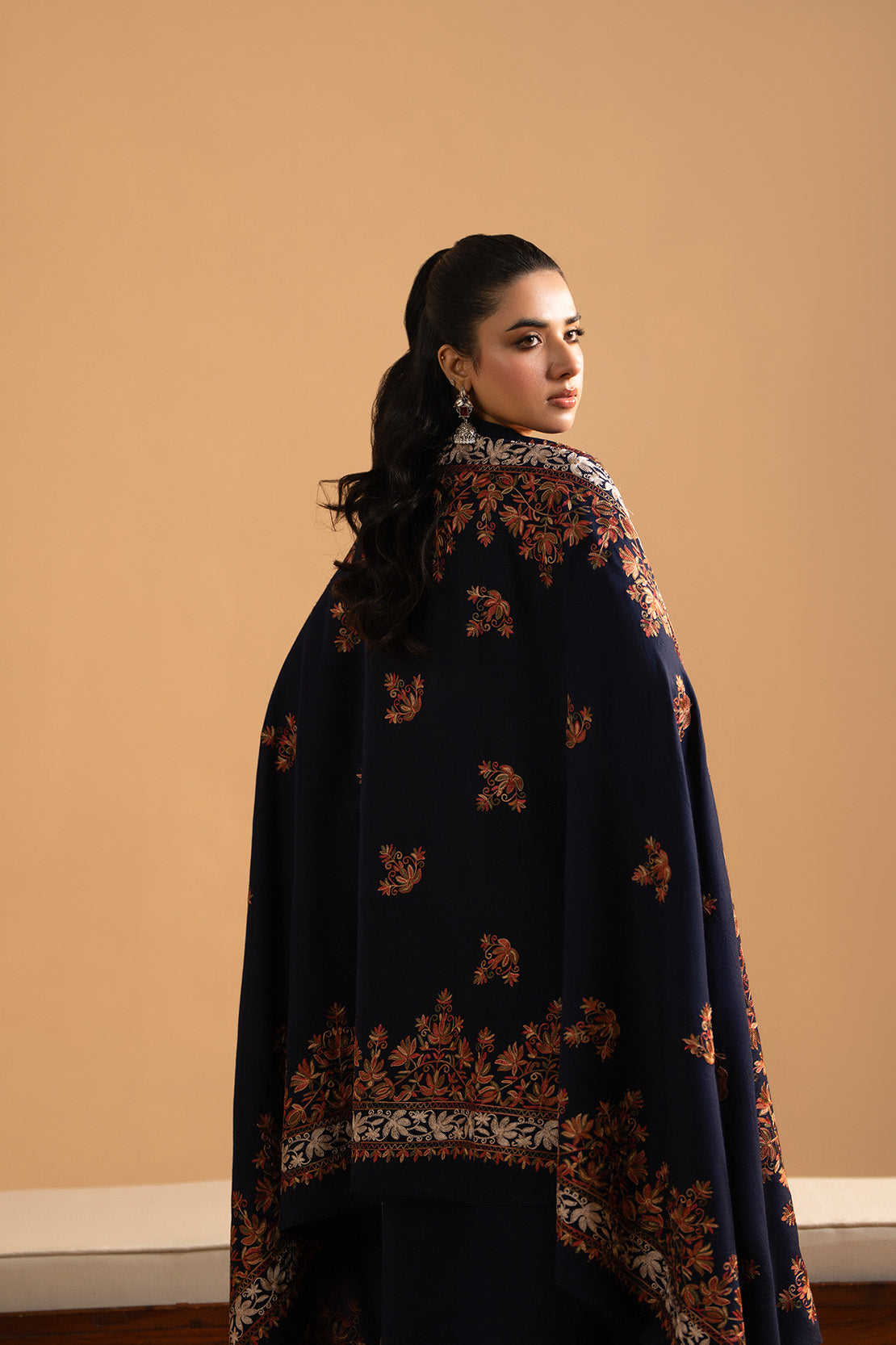 A beautifully fully embroidered shawl, adding grace, warmth, and a luxurious finishing touch.