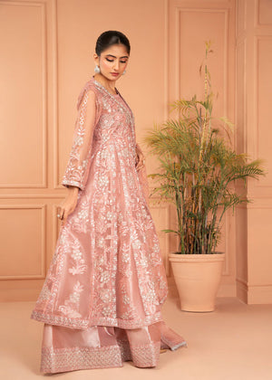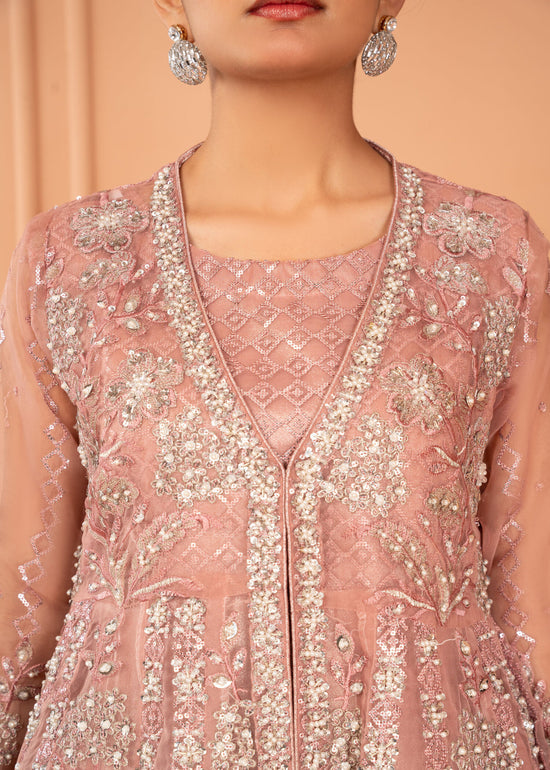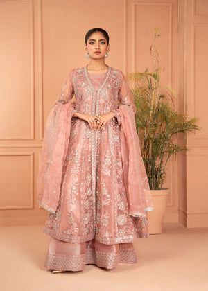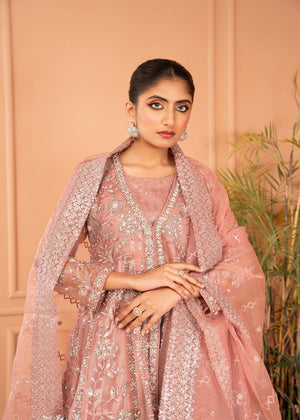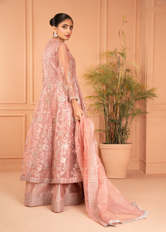 The peach-colored organza gown-style frock serves as the centerpiece of the ensemble, exuding grace and allure. The frock is adorned with intricate embroidery and embellishments, featuring delicate beadwork, tilla work, and adda work. These exquisite details cascade across the fabric, creating a mesmerizing tapestry of craftsmanship. Paired with the frock is a pair of viscose sharara trousers, elegantly enhancing the ensemble's silhouette. The sharara trousers boast an embellished lower border, echoing the opulence of the frock and adding a touch of glamour to the overall look. Completing the ensemble is a matching organza dupatta, adorned with embroidery and ornamental work. It's a perfect choice for special occasions or cultural events, where you want to make a memorable statement with your impeccable sense of style and refinement.