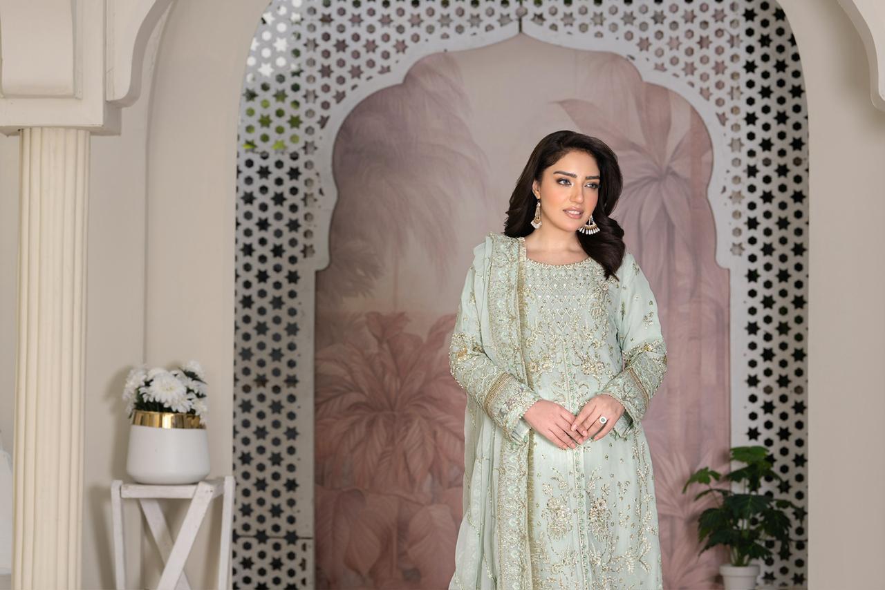 A stunning designer ensemble crafted with meticulous handwork and premium fabrics. This outfit exudes grace, femininity, and timeless elegance, making it an ideal choice for festive celebrations and formal occasions.