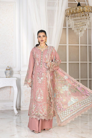 A luxurious chiffon ensemble featuring a beautifully handcrafted neckline adorned with 3D embellishments, intricate thread work, stones, and pearl detailing. It is paired with a printed silk dupatta enhanced with golden block print, adding a perfect festive touch to the look. This outfit exudes timeless grace and refined craftsmanship.
