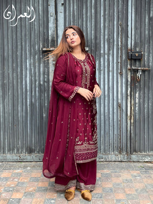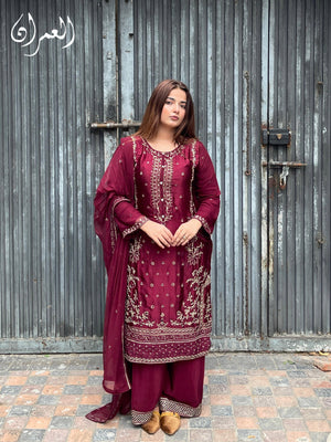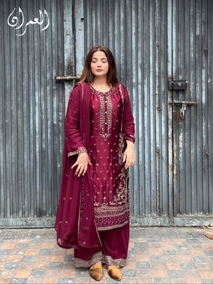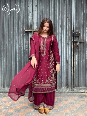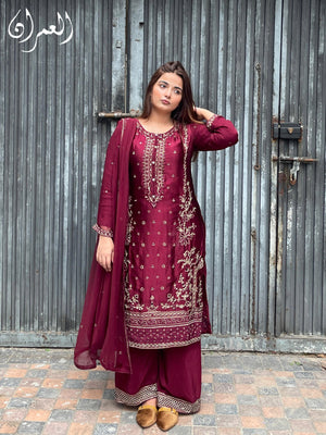 Drape yourself in timeless elegance with this rich maroon silk ensemble, adorned with delicate golden embroidery. The luxurious silk flows effortlessly, while the deep, regal hue exudes sophistication. Perfect for festive soirées and wedding celebrations, this outfit blends traditional charm with modern grace—making you the center of every occasion.