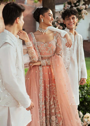 Make a bold and unforgettable entrance with this regal bridal gown by Akbar Aslam. Featuring a distinctive square neckline, this gown frames the décolletage with elegance, adding a touch of modern sophistication to its traditional design. The bodice is adorned with intricate embroidery and shimmering embellishments, flowing into a voluminous skirt that creates a striking silhouette. The full sleeves and richly detailed dupatta complement the ensemble, ensuring you exude grace and opulence. Perfect for the bride who desires a blend of classic beauty and contemporary flair, this gown is a true masterpiece of craftsmanship.