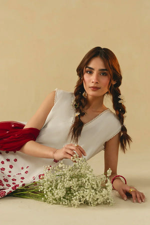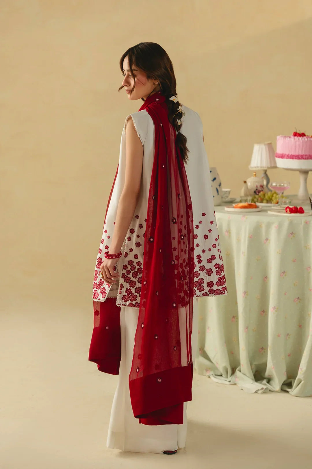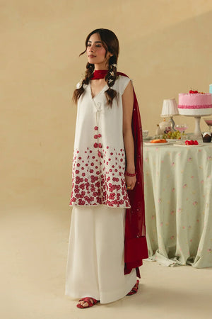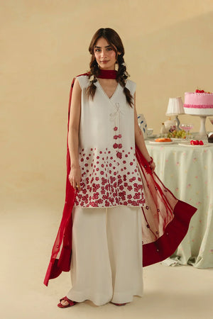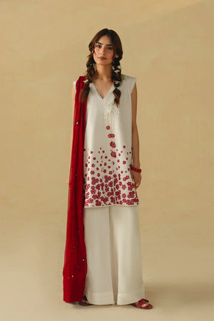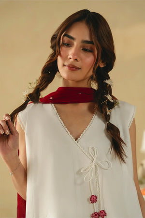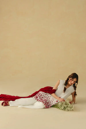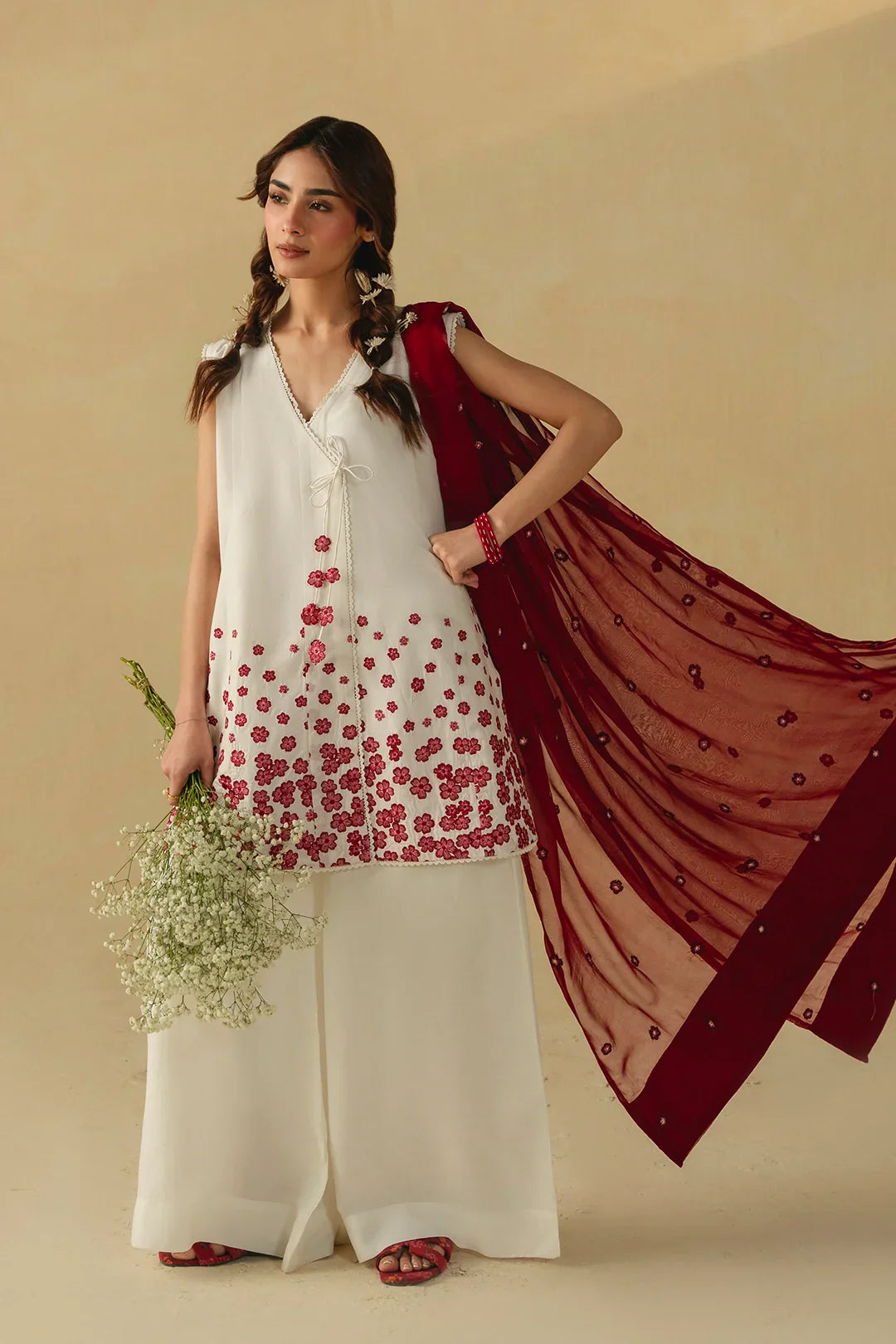 • A timeless three-piece ensemble featuring a short angrakha with a heavily embroidered hem and delicate tassel details. Paired with wide white trousers and a coordinating embroidered dupatta, this design exudes elegance and classic charm.