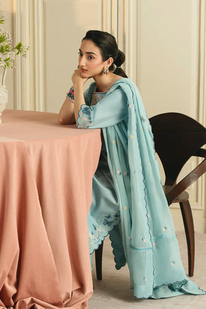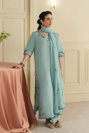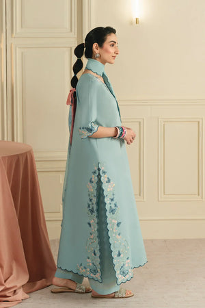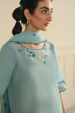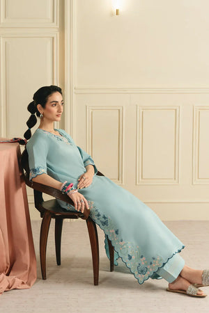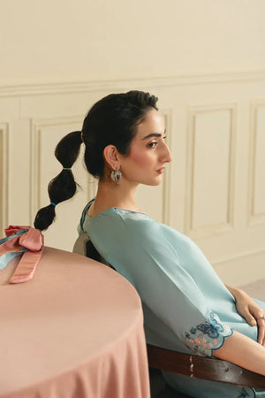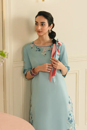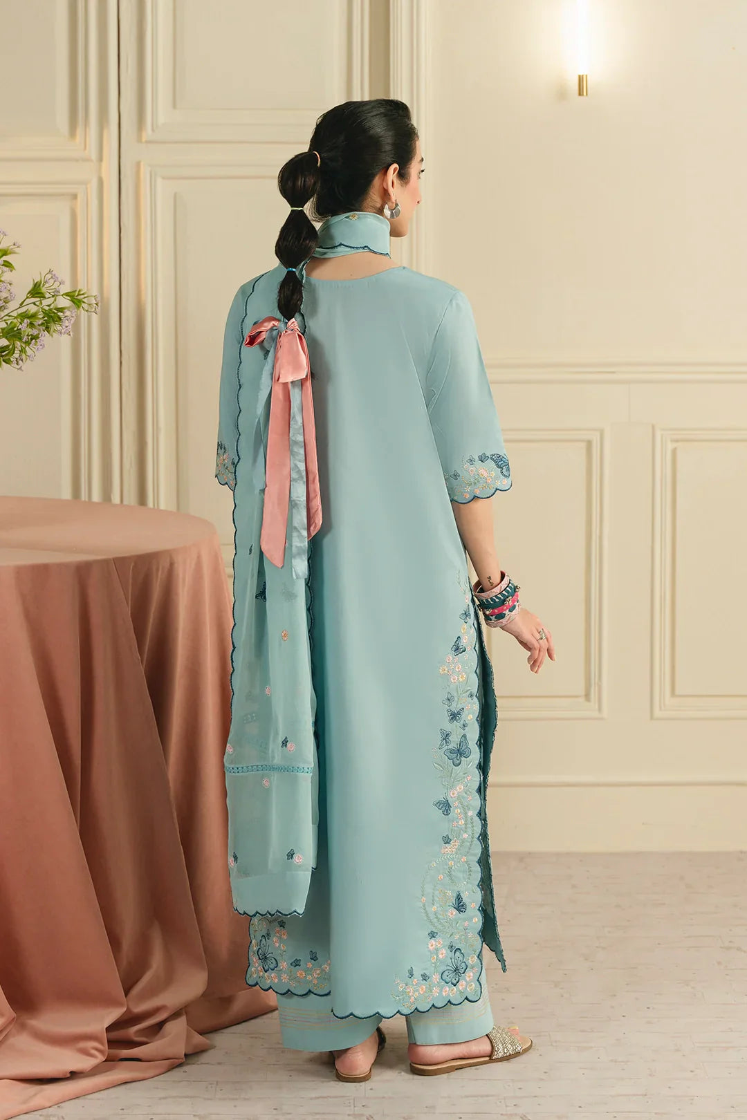 • A graceful three-piece ensemble featuring a long shirt adorned with butterfly-pattern embroidery on the sleeves, hem, and neckline. Designed with a flattering U-shaped neckline and short sleeves, the look is completed with a chiffon embroidered dupatta and a farshi shalwar finished with contrasting top-stitch detailing for an elegant finish.