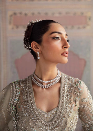 Make a statement on your special day with this exquisitely crafted bridal gown by Akbar Aslam. The gown showcases intricate embellishments and masterful beadwork that catch the light beautifully. The carefully embroidered bodice flows seamlessly into a voluminous skirt, creating a graceful and elegant silhouette. Paired with a sheer dupatta, this ensemble balances traditional craftsmanship with modern sophistication, perfect for the bride who desires both timeless beauty and a contemporary touch.