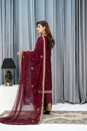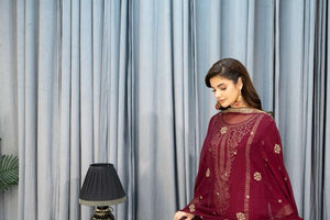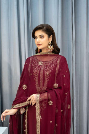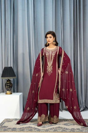 Experience timeless grace with our luxurious silk ensemble. The shirt is beautifully adorned with intricate threadwork, sequin, and tilla embroidery, creating a perfect balance of elegance and charm. It is paired with an embroidered chiffon dupatta that adds a soft, feminine touch. The look is completed with a grip fabric plazo, detailed with an exquisite embroidered patch — making this outfit a stunning choice for festive and formal occasions.