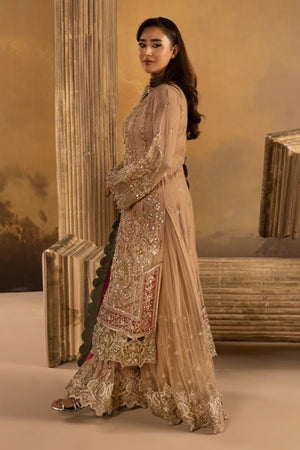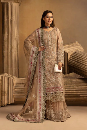 This beautiful 3 piece suit features a straight shirt with luxury thread work embroidery with motif and sequence embellishments with full length embroidered sleeves. Paired with a net embroidered sharara and the look is finished with a net embroidered dupatta.
